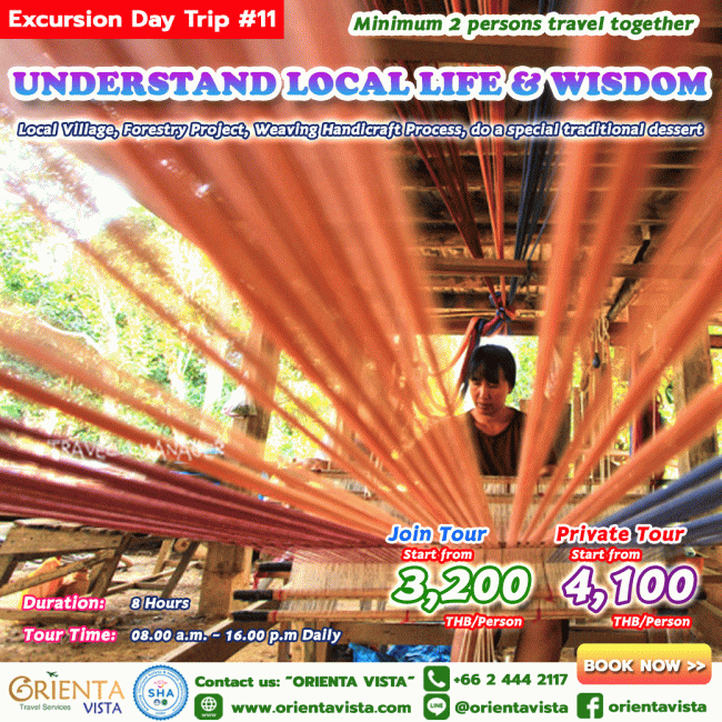 EXCURSION DAY TRIP #11 UNDERSTAND LOCAL LIFE & WISDOM DOWNLOAD PROGRAM HERE !! EXCURSION DAY TRIP BOOKING FORM For more information, please don’t hesitate to contact us “ORIENTA VISTA” Telephone: +66 2 444 2117E-Mail: orienta.v@gmail.com Line: @orientavistaFacebook: www.facebook.com/orientavista Share to your friends