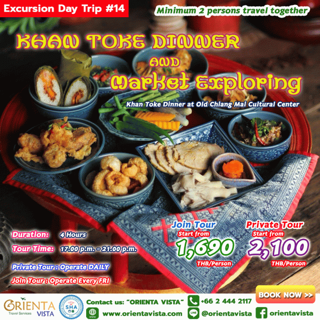 EXCURSION DAY TRIP #14 KHAN TOKE DINNER & MARKET EXPLORING DOWNLOAD PROGRAM HERE !! EXCURSION DAY TRIP BOOKING FORM For more information, please don’t hesitate to contact us “ORIENTA VISTA” Telephone: +66 2 444 2117 E-Mail: orienta.v@gmail.com Line: @orientavista Facebook: www.facebook.com/orientavista Share to your friends