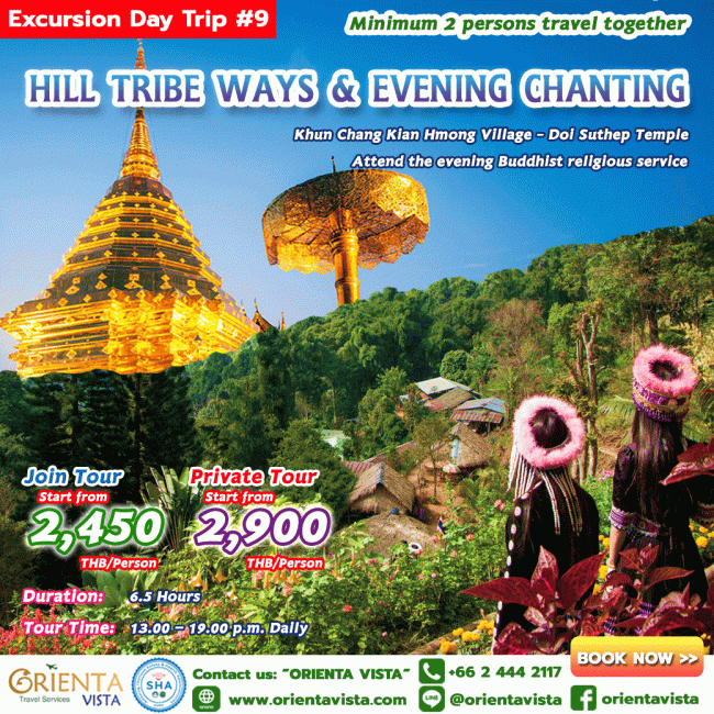 EXCURSION DAY TRIP #9 HILL TRIBE WAYS & EVENING CHANTING DOWNLOAD PROGRAM HERE !! EXCURSION DAY TRIP BOOKING FORM For more information, please don’t hesitate to contact us “ORIENTA VISTA” Telephone: +66 2 444 2117E-Mail: orienta.v@gmail.com Line: @orientavistaFacebook: www.facebook.com/orientavista Share to your friends