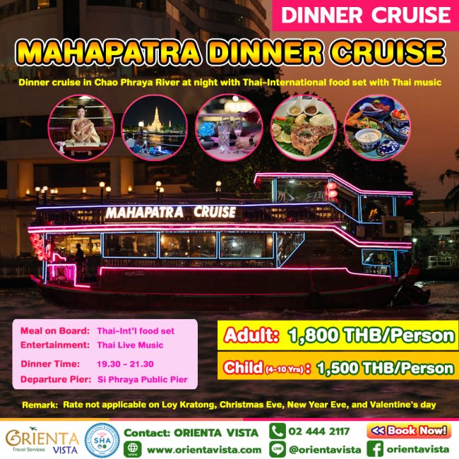 Mahapatra Dinner Cruise Dinner Cruise “MAHAPATRA CRUISE” A new experience with a dinner cruise “Mahaphetra Cruise” in the middle of the Chao Phraya River. Immerse yourself in a simple but romantic atmosphere, taste a fusion of Thai cuisine, listen to beautiful music from the Khim instrument, making your special night with your loved one touching,…