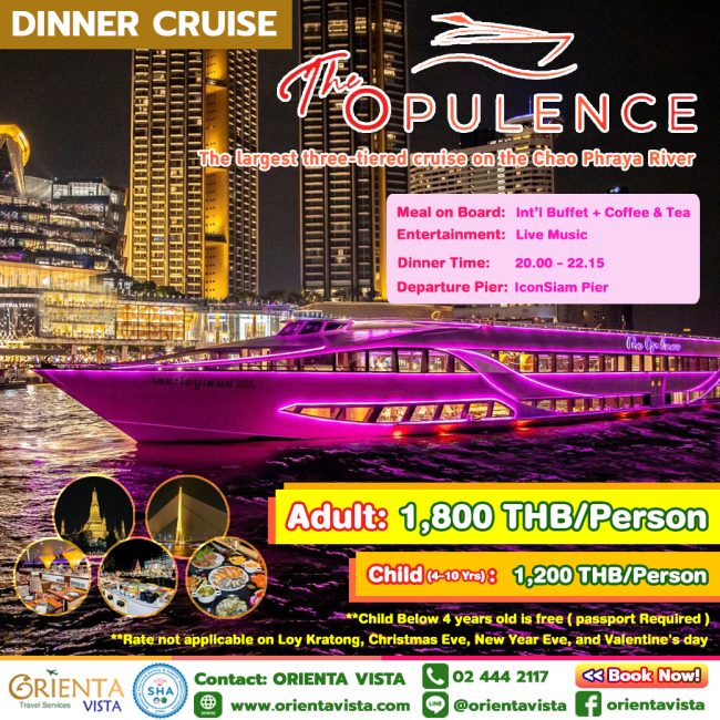 The Opulence Dinner Cruise Dinner Cruise “THE OPULENCE CRUISE” Experience the beautiful and luxurious, 3 floors cruise, the largest one on Chao Phraya riverFalling inside the beautiful and valuable boat with new furniture and underwater lighting Enjoy the delicious food, both Thai and international buffet, seafood, ice cream and much more Opulence means wealth, richness,…