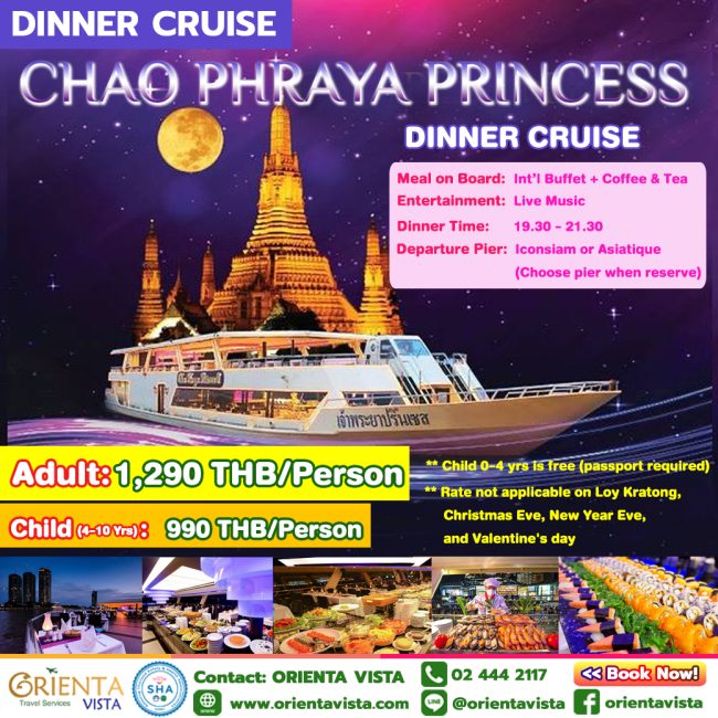 Chaophraya Princess “Dinner” Cruise Dinner Cruise “CHAO PHRAYA PRINCESS CRUISE” Enjoy the night view, cruise through important landmarks of BangkokInternational buffet and seafood, full line, refill as much as you wantEnjoy live music and fun on the boatMeet tourists from many countries from all over the world Chao Phraya Princess, one of the pioneers of…