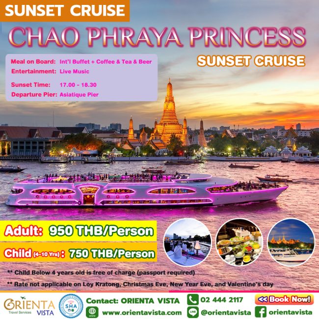 Chaophraya Princess “Sunset” Cruise Sunset Cruise “CHAO PHRAYA PRINCESS CRUISE” Sunset cruise with Chao Phraya Princess with a variety of buffet menus.And there is also a beer buffet. Throughout the journey, you will enjoy live music that provides happiness all the way. Chao Phraya Princess, one of the pioneers of dinner cruises in the middle…